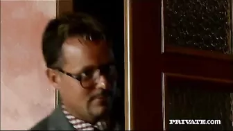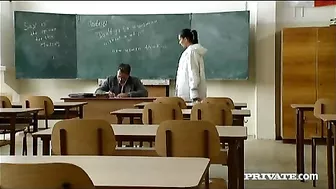 Description: Julie Silver and Vanessa May team up to have sex with one of their teachers. After receiving a gift from each of them they join him at his home. The brunette joins them in the living room where they give him a double blowjob. After fucking their pussies he screws one in the ass before cumming.