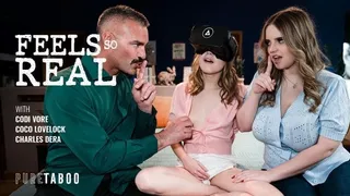 Description: Codi Vore and her husband Charles Dera gave their stepdaughter Coco Lovelock a VR headset for her 18th birthday and theyre wondering if she likes it. Codi and Charles decide to go to Cocos room to see if shes enjoying it. The stepparents arrive at the doorway to Cocos room and sure enough it turns out that Coco is on her bed and wearing the VR headset... and from the way shes making suggestive hand motions and then touching herself its clear that shes using the headset for virtual sex. Codi and Charles find themselves getting aroused and sneak closer to Coco to get a better look. Coco hears them approach but pretends not to notice mischievously putting on a show for them by doing sexy poses and continuing to masturbate. Codi and Charles get so turned on that they start to touch each other while continuing to watch Coco. Eventually Coco decides to take her sexy game to the next level inviting Codi and Charles to join her for some twisted family fun...
