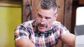 Description: Mandy Muse is in front of the computer in the reception area of her massage parlor clearly frustrated that it is not working. Thankfully help is on the way. I wonder what kind of a wimpy nerd the computer company will send me this time Mandy asks herself and her question is immediately answered as Charles Dera the I.T. guy walks in. Mandy is utterly shocked to see the gorgeous slab of man in front of her the complete opposite of the geek she was expecting. She looks Charles up and down. Im so glad you...came she says lingering on that last word as she takes in the view. Charles is oblivious to her innuendo and asks her how he can help. As she stays seated they chat about what may be wrong with the computer. He suddenly grips the arms of her chair and lowers himself to his knees his face now inches away from her groin. Oh my says Mandy under her breath. A tense moment passes. Finally he uses the chair arms he is holding to push the chair and roll her away from the computer telling Mandy that hell just have to check the computer under her desk and he needed to make room. Oh of course! What else would Charles be doing down there Charles shifts over to look at the cables bending over a little in the process. Mandy cant help but ogle his ass. Wow that is tight he says. Oh you have no idea Mandy says quietly. Charles is sorry he couldnt hear what Mandy said he was busy saying that the space under her desk is tight so its a challenge to work. Has Mandy tried turning the computer off and on again he asks as he pops back up. Yes Ive been trying to turn it on but it just doesnt seem to be getting the point! Mandy says in frustration. Well in that case hell have to reset the network which he promptly sets to work on. He finally turns to look at her giving her an update on the fix saying that they will need to wait while the network resets. He turns his head to look back to the screen but then winces his neck seems to be in pain. A light bulb goes off in Mandys head. She smiles slyly as she sees her opening. She comments to Charles that it looks like his neck hurts. Stooping over all day to fix computers must really wreck his posture. Charles agrees telling Mandy that his neck is super stiff. Well then its lucky that she is an expert at handling stiff things. Maybe Mandy should give him a massage Again Charles is oblivious to her innuendo. Well he says hes not really allowed to do that when hes on the clock. Mandy counters by telling Charles that she would love to do it to repay him for fixing her computer. And besides what else will they do while they wait for the network to reset Charles accepts. Mandy leads Charles into the shower. Hes initially surprised about the shower and unsure again but Mandy assures him that its all part of the experience. She trusted him to fix the computer and now Charles has to trust her to fix his neck. After a bit of reluctance Charles disrobes. He tells Mandy that he needs to take off his glasses in the shower so they dont get fogged up but he wont be able to see. Thats ok she says its all about how it feels. Charles takes off his glasses. Mandy takes in his naked body and is clearly impressed. She can barely keep her hands off of him. Mandy begins to soap Charles up from behind. She asks him to turn around and begins to wash his dick. When Mandys right hand reaches his cock she is so overcome with horniness that she starts to rub her pussy. Charles sees that shes doing something. Unable to make out exactly what it is he squints but still cant quite see. Charles asks her what shes doing. Still pleasuring herself Mandy stifles a moan and tells Charles that shes just getting a good lather going with the soap. Charles should relax and let her do her thing. Still washing him Mandy continues to pleasure herself and eventually cums with a hand over her mouth. Charles asks her what that sound was. Mandy says it must be the network rebooting in the other room. Mandy tells Charles to rinse off and follow her to the other room where theyll proceed to the massage portion. Charles retrieves his glasses and carries them in his hand as they go to the massage room. Lying down on the mat and placing his glasses to the side Charles comments that his neck feels amazing and that this is more relaxed than hes felt in a long time. He is noticeably more talkative and less guarded. Oiling him up Mandy tells him that she did notice that he was basically all business before. She jokes that she thought he didnt like her or something. Spreading oil on Charless muscled body he responds that no it wasnt that its just that hes super shy around new people. Thats why Charles got into I.T. in the first place. Sometimes its easier to work with computers than it is with people. Mandy is surprised telling him that she cant believe a guy with a body like his is shy. Why is Charles shy ! He thanks her bashfully and tells Mandy that hes always been kind of a nerd. He has always been very inhibited. Hes always wanted to be better with people but hes never really had the chance. Still body sliding on Charles Mandy sees an opening and pounces. Well if Charles wants she can help him practice his people skills. As she says this last part her hands creep toward his dick. Charles is hesitant and stops her hand with his. She barely knows him. Theyre basically complete strangers wouldnt it be inappropriate he wonders. Her hands slide around his dick. She tells him that she doesnt think theyre strangers anymore. And besides doesnt Charles get bored playing with computers all day Her hand still around his dick Mandy grabs Charless hand and brings it to her pussy. Doesnt he want to play with something a little more... warm... and wet she asks. Charles finally cant resist the urge any longer. He wants Mandy! Mandy eagerly teaches the handsome nerd how to please a woman once she finally gets the chance to ride his cock. Fortunately for her he picks up on the techniques fast making her cum like shes never c