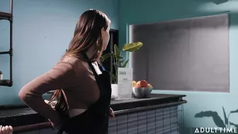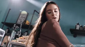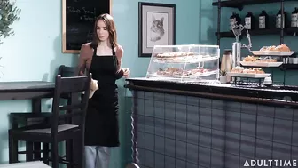 Description: Hazel Moore is working at a cafe doing some tidying up since there arent any customers at the moment. Her girlfriend Aria Valencia enters and Hazel teases Aria for showing up early Hazel still has half an hour left before her shift ends. But Aria cant wait gushing that Hazel looks so cute in her barista apron. Hazel is hesitant about getting frisky with her girlfriend on the job saying she doesnt want to get into trouble. But Aria points out that there are no customers right now so theres nobody around to catch them in the act. They start kissing then move on to undressing and enjoying the taste and feel of each others beautiful bodies. The cafe furniture and carpet gives them opportunities to try various different positions as they make love but can they really do all of that without getting caught