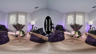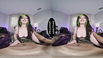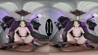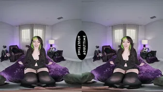 Description: Kitty Cam is feeling a little gothic today wearing her sexy attire of all black with only the bright green streak in her hair and big blue eyes standing out. Shes also surrounded by shades of purple and black adding even more to the gothic moody atmosphere. Even so Kitty is nothing but perky and sultry as she happily chats with Oliver Davis. When asked what she likes to do for fun Kitty gushes that she likes to be creative including by making her own clothes from scratch. Of course for this steamy VR experience Kitty wont be wearing ANY clothes for much longer!