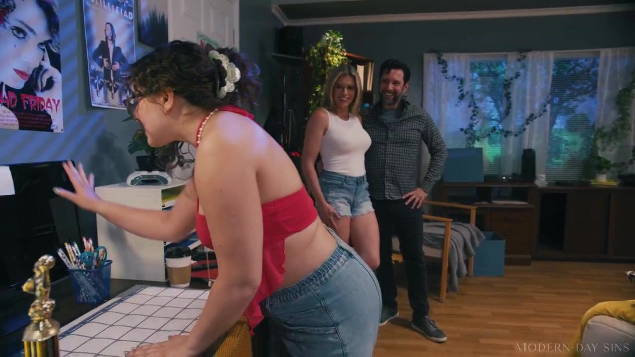 Description: A husband and wife Tommy Pistol and Cory Chase lure their boys hot new wife Leana Lovings over to their house alone to seduce her. Leana is surprised but also turned on by how bold and forward her parents in law are which leads to her delightfully giving in. But in the middle of the scorching sex Nick Strokes Tommy and Corys boy and Leanas darling husband stops by unannounced. Tommy and Cory then take turns distracting the innocent and oblivious Nick while still sneakily having wild sex with Leana behind his back. Will they be able to keep Nick in the dark