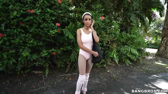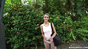 Description: The guys are trying to go to the beach before driving by this ballerina walking on the side of the street. Of course they stopped to help out this 20yo ballerina named Ariana. The offer cash just to talk and it lead to some tit flashing before finally convincing her inside the bus for a ride. Things went better than planned the hot chick got paid and convinced to lets her tits out and to show of her nice ass. The stud inserted his cock and she just loved it. We see her get pounded from multiple positions until her pretty face ends with jizz all over.