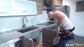 Description: Cassidy Banks walks overdo her boyfriend to get a massage but he dismisses her because the plumber is there and want to be left alone. This naughty girl lets her big tits loose and walks over to the plumber to get her massage. JMac freaks out but rubs her tits and ass with oil before she starts riding his cock. We see this busty chick give a good bj and tit fuck before JMac fucks her from different positions until he cums all over her mouth and face.