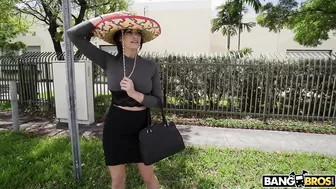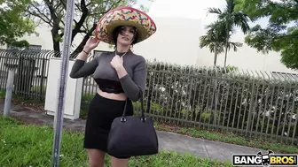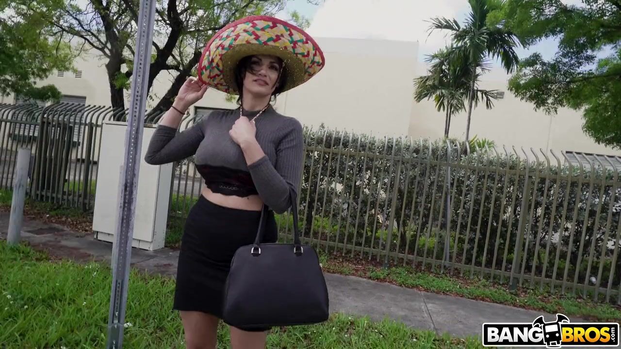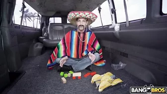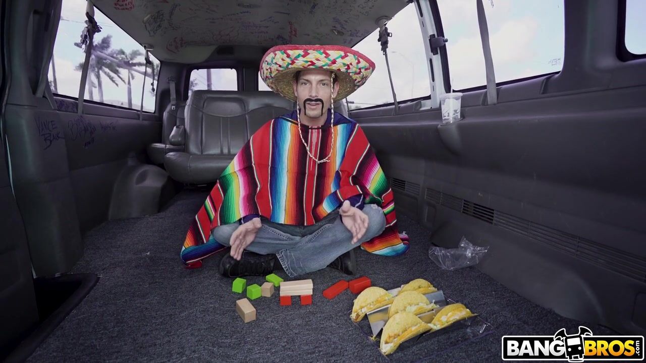 Description: Becky Bandini was walking to work when the Bang Bus pulled up. They were giving away free Tacos for Cinco de Mayo. Becky tried one but she did not like it at all. Anyway they offered her some cash for a quick Cinco de Mayo quiz. Becky wasnt a girl that would say no to money. Now they offered more cash for a traditional tittie flash. Go to work or earn easy money It was Cinco de Mayo after all. So Betty flashed her big tits. Now the ice was broken. It was easy to lure her into the Bang Bus. Tyler Steel was wearing a Mexican hat a poncho and a fake mustache. He pulled that poncho down and his giant dick emerged also with a fake mustache. Becky was intrigued. She started to suck it. Then Tyler took her doggy style. He fucked her well in several positions. Becky didnt get fucked in a while so she was screaming in pleasure. They asked her to pose in the poncho outside of the van. As soon as she was outside they threw the tacos in her face and sped off into the sunset.