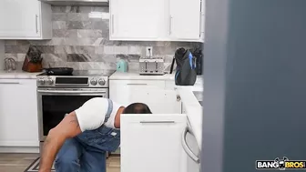 Description: Kali forgot that she had a plumber coming over today. First she was annoyed that she had to deal with a plumber so early in the morning but then her attitude changed when she saw the plumbers huge bulge poking through his overalls. From that moment she decided to start putting the moves on him. Everything he would say she would turn sexual. Yet no matter what she did he wasnt catching in. She even came back wearing only lingerie and this dude still couldnt catch her drift. Until eventually she had to straight up tell him. Finally he figured it out and jumped head first into her perfect tits. From there Kali dropped to her knees and started choking on plumber cock before he took her to the couch to let her ride his long pipe. After fucking her in several positions she began to beg for him to clog her pipes.