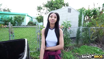 Description: Today we found this hot ebony chick walking around the back alleys in a Miami. She claims that she was a student and was on the way back home to her boyfriend but with a little cash offering we get her attention and get her to hop in the van for ride. This chick ends up being a terrible girlfriend as she get her to get naked and grab a hard cock kind of quick. She ends up giving Tyler a good fucking before he starts fucking her hard from different positions until she got to swallow some cum. This girl fucked hard for her money and hopefully her boyfriend Jamal can give it to her cause we sure didnt!!