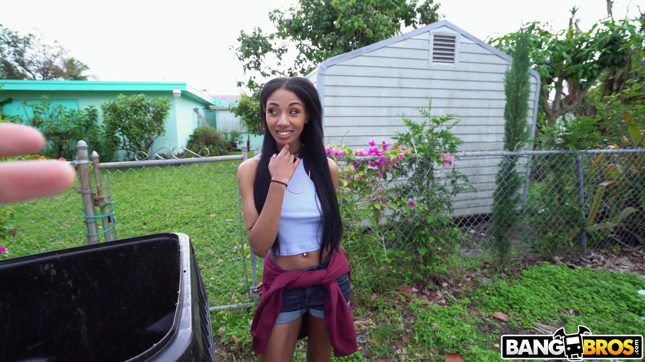Description: Today we found this hot ebony chick walking around the back alleys in a Miami. She claims that she was a student and was on the way back home to her boyfriend but with a little cash offering we get her attention and get her to hop in the van for ride. This chick ends up being a terrible girlfriend as she get her to get naked and grab a hard cock kind of quick. She ends up giving Tyler a good fucking before he starts fucking her hard from different positions until she got to swallow some cum. This girl fucked hard for her money and hopefully her boyfriend Jamal can give it to her cause we sure didnt!!