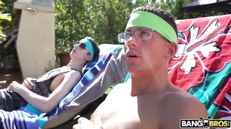 Description: Cory Chase finds a mess in her pool and walks over to her step sons to make sure it gets cleaned up. The horny stepsons day dreams of her inviting him to fuck her but snaps back to reality with a slap. She decides to boss the guys around to clean up and to get her to cum. She has them licking her pussy and ass before she sucks them both off. She takes turns fucking the guys until she makes them both cum all over her face.