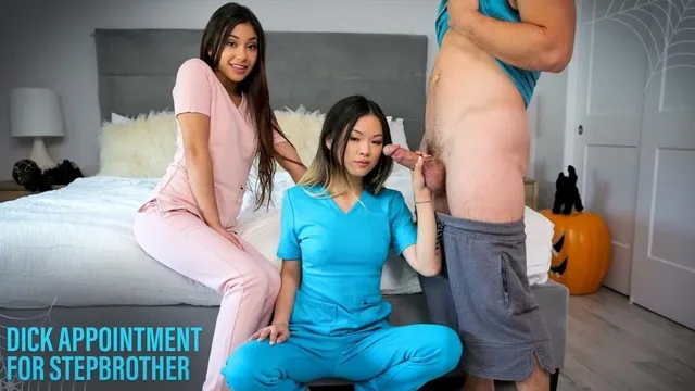 Description: Lulu Chu is hanging out with her BFF Xxlayna Marie but she finds that she s restless. She has had the hots for Xxlayna s stepbrother Robby Echo for a while now and today she decides it s time to start acting on that desire. Lulu begins by making a list of dick doctor questions. Then she blocks her phone number and calls Robby up and starts going. Telling Robby that she s calling from Dr. D s office Lulu goes down her list of questions under the pretense that it s Robby s annual penis checkup. Xxlayna has no idea what Lulu is up to but his answers get both of them really really hot. The girls can t keep their hands off themselves as Lulu continues her QA with Xxlayna s unwitting stepbrother. Eventually Lulu asks Robby if he can get hard and offers to talk dirty to him to help. Of course Robby takes her up on it then slides his hand into his pants to start jerking off until Lulu abruptly tells him she s got to go. After Lulu confesses that she was talking to Xxlayna s stepbrother Xxlayna tells her that she s always wanted to fuck him because the taboo makes it hot. Lulu encourages her to come with her to see what Robby was just bragging about. They decide to change into nurse outfits but before they can go to the living room Robby comes in to see if they ve been getting any weird phone calls. They reveal that it was Lulu on the phone the whole time and as soon as Robby gets over his surprise he seems open to the idea of taking things further. Next thing Robby knows his stepsister and her friend are on their knees with his dick in their mouth. It s a real life penis check up now as they explore every inch of his fuck stick with their hot eager mouths and roaming hands. The girls take things a step further as they push Robby onto the bed and then pull the pants of their scrubs down before climbing on top of him to keep on sucking. When they ve got Robby nice and hard Lulu takes the first go at hopping onto the D and bouncing in reverse cowgirl with Xxlayna rubbing her clit for double the pleasure. Seeing how much fun Lulu is having Xxlayna leaves behind the last of her inhibitions and gets on for a cowgirl ride while Lulu finger fucks herself beside them. Lulu gets another go with Robby as she lays on her back with him pounding away at her greedy snatch. When Xxlayna climbs onto Lulu s face so Lulu can eat her out it truly turns into a threesome. Xxlayna gets to have her go as she enjoys a doggy style pussy pounding with her face buried between Lulu s thighs to muffle her moans. Watching his stepsis cream around his dick is too much for Robby to take. He pulls out to nut on Xxlayna s back ending their hotblooded Halloween threesome.