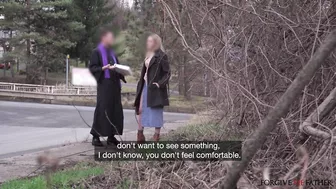Description: We saw this blonde Australian woman on the side of the road so I approached her and told her about our confession van. I admitted I was not a priest but that my friend Martin and I had money and technology to give to young women who were willing to come for confession. Once inside we realized this woman was surprisingly slutty. She had been dressed as a pet and drank from a saucer in front of two guys and four girls loved anal and even DP. We offered her money to fuck and she laughed saying she would ve done it for free! She sucked my cock and let me facefuck her throat then I fucked her pussy missionary and doggystyle. I absolutely pounded her in the spoon position then covered her face with a huge load.