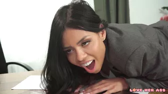 Description: Steve Q is having trouble with his new office hire Canela Skin. Canela can t seem to focus and when he takes a work call she starts yakking away on her cellphone too! Steve asks for quiet but his employee starts whistling. At the end of his rope Steve turns around to find Canela using the scanner to take pictures of her big ass! Steve tells Canela she s fired but she hikes up her skirt and begs to keep her job. At the sight of her delicious big booty Steve decides to fuck his employee first pulling down her panties and so he can eat her pussy and ass. Turned on Steve takes out his hard cock and fucks Canela doggystyle then takes off the rest of her clothes so he can enjoy her big fake tits. Canela goes ass to mouth and gives her a boss a blowjob then continues taking his dick until he blows his load on her face!