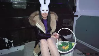 Description: We saw a woman standing by the side of the road selling Easter eggs and wearing a mask with ears to mark the occasion. She spoke Czech so Martin explained we would pay her for a confession. She joined us in the van where she confessed to naughty things like cheating on her ex boyfriend. We offered her 800 more euro for sex and the naughty woman agreed to fuck. I took out my big dick and she gave me a blowjob then I lay her back and played with her pussy. We stripped her so I could slap her perky tits then she threw her ass back against me in doggystyle. Finally she delightfully stuck out her tongue for my facial!