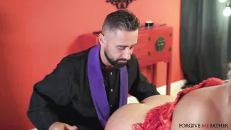 Description: There is a mystery afoot chez Blondie Fesser and Cassie Del Isla Blondie can t stop masturbating! Innocent Cassie calls in Father Mugur Porn to perform a righteous ritual and dispel the presence. Blondie is in her room on the bed and the thick blonde is dressed in red lingerie. Vigorously flicking her bean Blondie squirts all over the priest who gets down to work by stripping and eating her ass. Lots of spanks later Mugur is plunging his cock balls deep into Blondie who moans in delight of his ritual. Cassie joins in with a strap on and fucks Blondie s pussy while she gives Mugur a blowjob and he squeezes her big titties. Cassie also gets her fill of cock then Mugur leashes them both and covers them in cum!