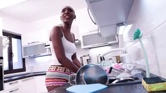 Description: Zaawaadi is doing the dishes alone when she gets the idea of asking her lover Darrell for help. Darrell doesn t like doing dishes and soon the couple is throwing water at each other! Zaawaadi s booty shakes and she cleans and it makes Darrell hard so she jumps his bones and kisses him. Darrell pulls down Zaawaadi s shorts and eats her hairy wet pussy on the kitchen counter then takes out his big dick to fuck her missionary. Turning the gorgeous woman around Darrell fucks her standing doggystyle in front of the open fridge and her nipples get hard from the chill. After he has made his woman cum Darrell creampies her pussy!