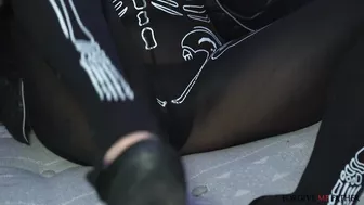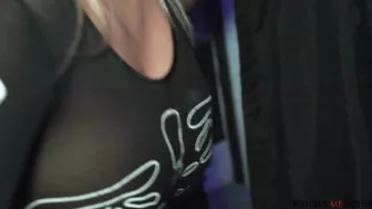 Description: We saw this blonde wearing a see through Halloween skeleton costume and she looked like a bad girl. She agreed she was and wanted the money and the tablet so she agreed to come to confession in the van. Once inside we asked her about all the bad things she had done. She told us she was a former swinger and once fucked twelve people in one night and loved big cock. She had sucked one yesterday cheating on her husband. We told her to close her eyes and I stuck my dick in her mouth. The blonde let me face fuck her then I tore off her costume and poured oil on her big titties. I titfucked her then turned her over and smacked her ass until it was red. I poured oil on her ass then fucked her pussy doggystyle and pounded her in spoon before filling her pussy with a creampie and kicked her back to the streets!