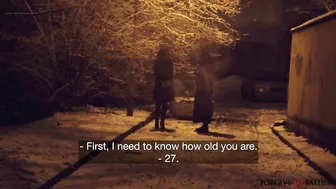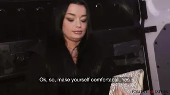 Description: We were doing our usual rounds late one night when we came across this beautiful woman standing by herself. I approached the hot brunette and after introducing myself I invited her to join me in the van for a confession. She agreed and once we were inside I offered the cumslut some cash in exchange for sexual favours. Soon the stocking clad babe was on her knees sucking and slurping on my huge dick! I fucked her pretty face then I got her to spread her legs and show us her pierced pussy. I fingered her tight juicy hole and played with her clit and the curvy nymph squirted her orgasm everywhere! I banged her in missionary position and afterwards we had a sexy side fuck on the floor. Feeling kinky I put a blindfold on the tatted up Ukrainian and then she bounced on my lap in cowgirl and reverse which gave me a nice view of her big titties. Next I fucked her from behind doggystyle while spanking her curvy bum before pulling out and leaving her with a sticky facial!
