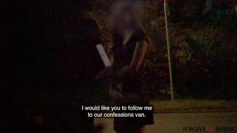 Description: We saw a young woman walking on the side of the road today and she looked very nice so we pulled over to chat. We offered her money and guidance if she could finish a confession and she happily joined us in the confession van. We asked her about the worst things she had done and this big tit bimbo told us she had sucked and fucked her own step father! We demanded to see her pussy and she happily obliged and when we said to suck dick she was more than happy to swallow my cock. This woman rode me on the van floor and her pussy was to tight that I creampied her.