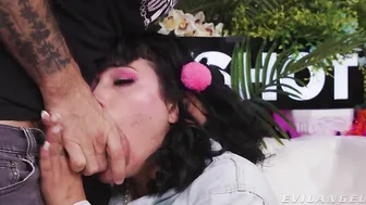 Description: Lovely pig tailed brunette Beca Barbie wears a denim jacket over a pink leotard and white stockings. Macho XXX stud Nade Nasty enters to grope the sultry starlet. Her panties disappear as he smacks her ass and fingers her butthole. She makes herself choke up spit and uses the slop to lube her twat. Beca sucks Nade s dick submissively. Nade slaps her face playfully as she chokes on his cock. Next he fucks her pussy. He gently chokes her Beca s as he pumps her twat with raunchy authority. Nade shoves a hose length dildo into her mouth. He fucks Beca s box doggie style. She sucks his balls and provides a slimy deepthroat blowjob. Nade rails her snatch in various positions. Foot fetish Kinky Beca sucks on his feet worshipfully. The dirty girl rims his asshole. The fun comes to a freaky finish as Nade jerks off till he nuts on her forehead. In a classic cum facial gobs of jism slather sweet Beca SEE MORE