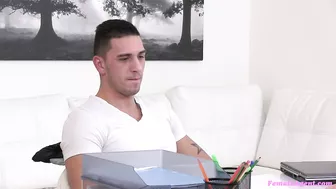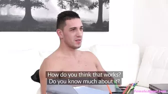 Description: I like inexperienced men they re always nervous and I can guide the interview in a way that humors me. This trim lad clearly liked the gym and fancied himself as a stud so I decided to prolong his interview a bit and tease him. He was sitting there with his top off thinking