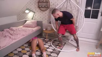Description: Claudia Bavel and Max Dior are hanging out while Max is reading a book. He asks Claudia to plug in an extra lamp and the outlet is under the bed. When Claudia goes under the bed she gets stuck and asks Max to help her out. Max wants to help but his eyes and hands are drawn to Claudia s thong clad booty! Max pulls her panties to the side and licks her pussy and big booty then after the rimjob he takes out a big dick and bangs Claudia doggystyle. Things get hot so he picks up the bed to let her out sits in a swing and tells her to suck his dick! Claudia gives him a blowjob then takes his cock in her pussy while playing her her big tits. After riding Max reverse cowgirl Claudia grinds on him until he creampies her.