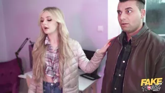 Description: When British bombshell Baby Kxtten and her boyfriend Don Diego check into the Fake Hostel Steve Q is instantly attracted to the petite blonde. After showing them to their room grey haired hunk Steve approaches Baby Kxtten who treats him to a sneaky blowjob before sticking out her tight firm ass for a doggystyle fucking! Afterwards the horny pair do some 69ing with Baby Kxtten rimming Steve and gagging on his thick cock and then the cheating slut bounces on his rod cowgirl style while flashing her small perky tits! At that moment Don discovers his girlfriends naughty antics which turns Baby Kxtten on even more! After appeasing her boyfriend the filthy Brit is up for a wild threesome so dark haired Don and Steve take turns fucking Baby Kxttens face and pussy as the inked up nympho rubs her clit. Once she s cum multiple times Baby Kxtten gets on her knees and sucks them both off until she s rewarded with a hot double facial!