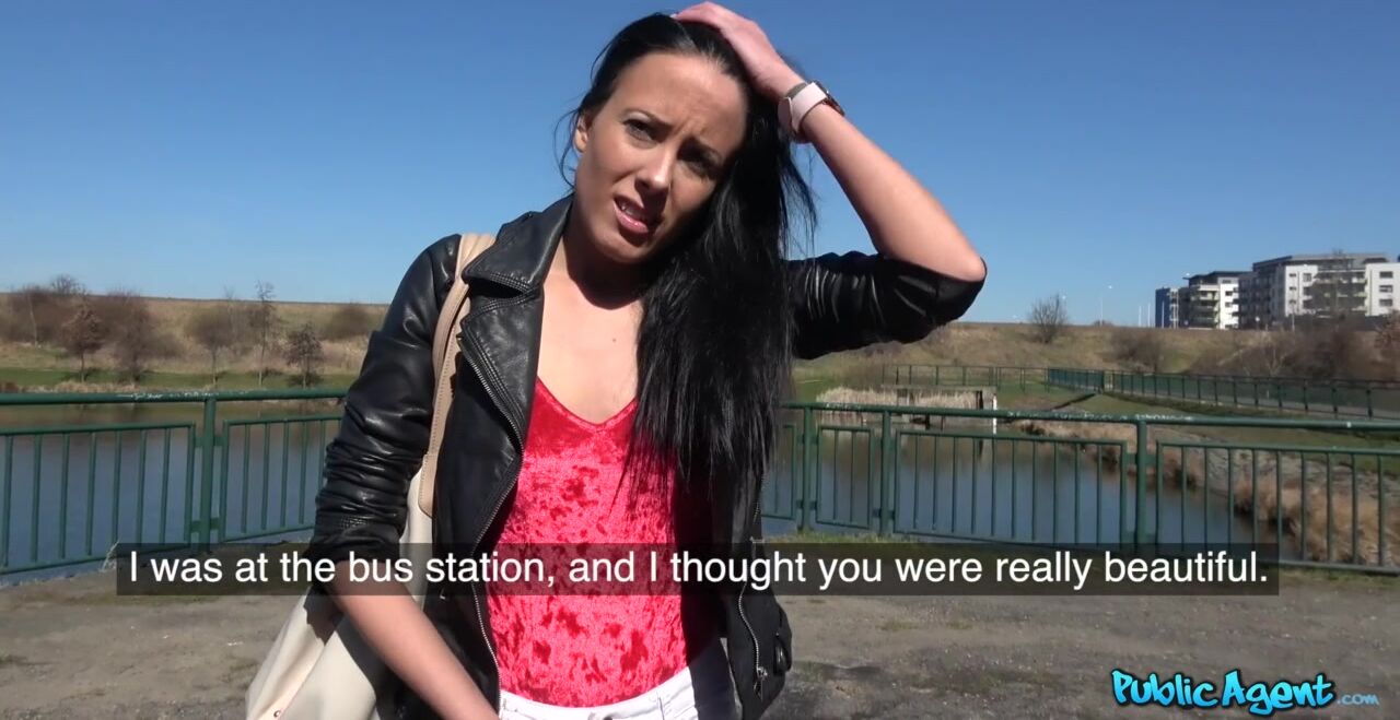 Description: I saw Abigail Ash get off the bus and she had such a great ass that I had to approach the raven haired hottie. Abigail was on holiday from Hungary and was only in Prague for two days. We started chatting and Abigail mentioned she was an art student and part time waitress so I figured she could use some extra money. I offered her a few bills if she would come to a private place with me to do a casting just a few pictures of her small boobs and her gorgeous ass. Once I saw her ass in her red thong my dick got hard instantly. I offered her more money for a blowjob. She was hesitant but once she saw my dick she wanted to do more than just suck it! We fucked on the public walkway then I came in her mouth and she swallowed every last drop.