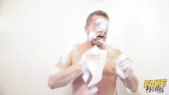 Description: The Landlord checks blonde babe Zlata Shine into the Fake Hostel and then realizes he stinks! Rushing to the shower the Landlord starts to scrub but quickly realizes he has used too much shampoo! The suds get into every crevice he has but unfortunately also into his eyes. Blinded the Landlord cries out for help and Zlata comes running. She helps him towel off then gives him her healing touch... and a blowjob. Turned on the Landlord fucks Zlata and her big tits bounce then he lays down a towel for her to ride his cock. Zlata gives the Landlord more head and even a rimjob then the fingers and fucks her until her pink pussy is gushing! The pair head back to the tub and the Landlord covers his client with a facial!