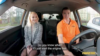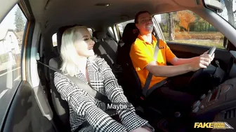 Description: I had a new student in the car today a tiny blonde named Marilyn Sugar. Marilyn had only done two theory classes so she was pretty new when it came to driving techniques. I showed her around the car a bit the seats the steering wheel and the pedals. We drove along together and I tested her a bit then pulled over so she could take over behind the wheel but she was afraid. I told her we could do it together she could sit on my lap and I would work the pedals. We drove a little and this excited Marilyn and when we parked I told her to grab the handbrake... but she grabbed my cock instead! Marilyn started to jerk me off so I played with her tits as she rubbed my dick all over her pussy. She sat on my cock I fucked her pussy then she gave me a blowjob. I fucked Marilyn in the backseat then pulled out of missionary position just in time to cover her with cum!