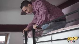 Description: Ariela Donovan and Jack 23 find out they will be roommates in the Fake Hostel and Ariela demands the bottom bunk. When Ariela leaves the room Jack goes through her suitcase and finds a pair of her panties. Turned on Jack strips then puts the panties on and gets into her bed. Ariela catches the sneaky little pervert but she gets horny so she gives him a blowjob. Ariela tells Jack to squeeze her tits then she bounces her ass up and down taking his dick in her pussy. After Jack makes Ariela climax in the spoon position he pulls out and covers her with a thick load of cum!