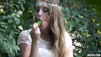 Description: There s no way an eggplant is going to fit into Harley Jade s tight wet pussy but the skinny cucumber she picked just isn t cutting it. It looks like this blonde hippy chick is going to have to look elsewhere for the orgasms she craves!