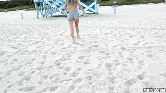 Description: Approaching the hottest blonde on the beach is easy when your pocket is full of cash! For some extra vacation money smokin bikini babe Molly whips out her big natural tits and shows off her cock riding skills right beneath the lifeguard tower.