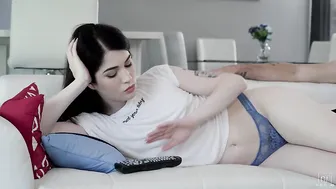 Description: Laying on the couch with Nathan Bronson Evelyn Claire clearly isn t into watching TV. She tries shaking her booty to get Nathan s attention. When that doesn t work she drops the control on the ground so she can lean over with her ass in the air to get it. Evelyn waits one more moment and then goes from subtle to obvious as she rubs her feet and then her hands across Nathan s dick. When Nathan finally turns his attention to her Evelyn is quick to reward the change. She goes down on him immediately wrapping her puffy lips around his cock. Meanwhile Nathan slips his hand between Evelyn s thighs so he can rub down her hot little pussy over her panties. That just encourages Evelyn to keep going harder until she s deep throating Nathan s hardon. Peeling off her shirt to reveal her perky all naturals complete with her small but hard puffy nipples Evelyn resumes sucking. Nathan lets her go for a second more then brings her up to kiss his own musk from her lips. Evelyn gives him a smoldering look that says everything she wants without words. Then she gets to her feet and rolls her underwear down her long legs so she can seat herself on Nathan s stiffie. Bouncing up and down on her boyfriend s dick is just the beginning of what Evelyn s been after. She turns around for some reverse cowgirl action as she rubs her clit to double down on her pleasure. Her sweet moans fill the air as she rocks her hips. Then her bucking gets less rhythmic as the pleasure of her first climax takes over. Getting on her hands and knees on the couch Evelyn wiggles her bottom once again. Nathan is much more attentive this time so he gives her exactly what she wants. He takes it slow at first but eventually their passion heats to the point where Nathan drops all pretense of gentleness. Anchoring his hands on Evelyn s hips he goes to town for both of their deep delight. Evelyn still craves more as she rolls onto her back. She lifts one leg high as Nathan spoons behind her and then lays her head back in bliss as he shoves back in. When Nathan s hand slides to ride her clit as his cock rides her twat she can t help but come apart one last time. Moments later Nathan follows her down the rabbit hole as he pulls out just in time to shoot his load all over his girlfriend s thigh. Show More