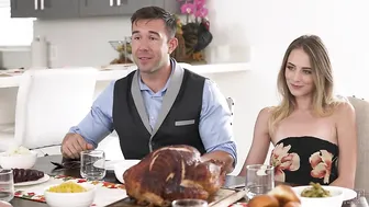 Description: Spencer Bradley and Kyler Quinn are enjoying Thanksgiving dinner with Ryan Mclane and Will Pounder their respective partners. The four of them are enjoying themselves but Kyler and Spencer want something more than the traditional dinner. They plot in the kitchen and then return to the table to show off their lovely assets for their boyfriends. Sitting down they each rub their boyfriend s dicks beneath the table. Instead of instigating a good time they just make the guys uncomfortable as they try to have a non sexual conversation. The girls aren t pleased that their partners are on their best behavior so they excuse themselves to get washed up for dessert. High tailing it to the kitchen they exchange a kiss. Kyler sinks down to lift Spencer s miniskirt and peel off her thong. Leaning forward she buries her face in Spencer s muff as she eats her friend out while Spencer tries to hold the moan. Kyler keeps it up until Will asks for a glass of water. Totally turned on and unwilling to take no for an answer anymore the girls swap partners and go for the D with Kyler fondling Ryan s cock and Spencer doing the same for Will s. When the guys don t go for it right away the girls point out that it s thanksgiving and they re feeling very very giving. Even then the guys hesitate but as the girls lean in to deliver deep kisses it s impossible to say no. Spencer climbs into Will s lap while Kyler hops onto the table that Ryan has just cleared for her. Ryan kisses his way down Kyler s body taking a pit stop at her plump titties. Meanwhile Will gets Spencer on the table and just goes straight for her damp twat. Once the guys have each had a taste of those musky juices they each whip out their hard dicks. Ryan shoves balls deep into Kyler s pussy right away while Will lets Spencer roll to her feet so he s fucking her from behind. Now that the girls have each had an appetizer they want to enjoy blowing their partners. Kyler gets on her belly with Spencer on her knees over her. The position lets Kyler suck Ryan s cock to her heart s content while Spencer can easily give Will s hardon the same treatment. The girls return to their original boyfriends as they swap cocks. Spencer finds herself leaning over the table with Ryan s hardon pounding away at her tight twat. Meanwhile Kyler sits Will down so she can climb onto him and bounce away in reverse cowgirl. Swapping boyfriends once again Kyler leans over the table so she can enjoy the same treatment Spencer just had from Ryan. Meanwhile Spencer climbs onto the table on her side for an acrobatic version of a spooning fuck courtesy of Will. That s too much for the guys to take. Once they re assured the girls have gotten off they each pull out with Ryan nutting on Kyler s thighs and bottom and Will showering Spencer in cum. Exchanging a kiss across the table the girls propose that this should be their new Thanksgiving tradition. Show More