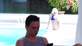 Description: An afternoon spent in the pool leaves Azazai feeling ready to relax. She climbs out and lays down on the pool deck to enjoy the sun. Slipping her hand into her bikini bottom she feels up her tender clit. Then she pulls her bikini bra aside and plays with her titties. That lingerie look gives her some ideas when she lays eyes on Nikki Nutz who s reading inside. Strutting up to the window Azazai makes it clear that she s in the mood as she presses her titties to the glass. Nikki beckons her inside then guides her over to the couch. Pulling Azazai s thong aside Nikki leans in to sweep his tongue up her soft folds. He finds the bud of Azazai s clit then closes his eyes in concentration as he goes for a long and languorous pussy feast. Azazai s hunger extends to more than just getting herself off. She gets Nikki to lay down on the couch then kneels above him with her tits still popped out of her bra as she unzips his jeans for access to his stiffie. Wrapping her sweet lips around the head Azazai alternates between licking and sucking at her musky treat as her hand strokes theroot. Nikki s position is perfect for more than just a blowjob. Azazai gets to her knees and shimmies out of her thong. Then she swings one leg over Nikki s lap so she is straddling him. Sliding down she impales herself for a reverse cowgirl ride. When Azazai needs a break from riding cock she falls to her side with Nikki still inside. They spoon together as Nikki keeps their party going. Lifting one thigh Azazai keeps herself nice and open for Nikki s continued ministrations. Their next position is doggy style as Azazai arranges herself on her knees with her torso leaning forward over the couch. As Nikki enters her from behind he leans forward to pepper Azazai s back with kisses. Azazai leans forward until her head hits the cushions to open herself for deeper penetration then raises herself up again as Nikki hits all the right spots to get her motor running. Climbing back into Nikki s lap Azazai gives him a slow and steady cowgirl ride. Nikki s hands on her bottom guide the speed of her strokes as they stare into each other s eyes. Leaning forward Azazai presses her breasts to Nikki s face as she rides him to the brink of climax. Then she rolls onto her back so Nikki can finish her off as she pulls her knees back to open herself completely. Now that Azazai has had her satisfaction she makes sure that Nikki gets his! Resuming her blowjob she sucks and licks Nikki to the edge of cumming. When he finally pops he fills Azazai s mouth with his cum a salty treat for her to enjoy. Show More