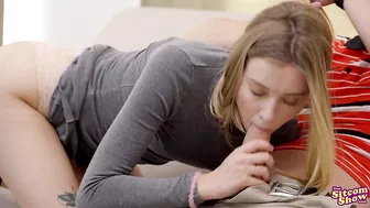 Description: Alan knows that Charlie has fucked Judith so Charlie decides to make it better by hooking Alan up with a friend who ll be there any second. Alan isn t interested in Charlie s so called sloppy seconds but when he lays eyes on Haley he changes his mind. While Alan dithers Haley walks inside and starts laying out sex toys on the couch for her MLM scheme. Alan says he doesn t know how to use any of Haley s products so she spreads her legs and pulls her panties aside to give him a demonstration of how to use the vibrator. She offers to let Alan have a try and instructs him in its use. When Alan scoots closer to get better instruction Haley sees his boner and offers to take care of him. Alan agrees and seconds later Haley has her lips and hand working together to worship Alan s big dick. She can t get enough of deep throating that hard cock and things only get better when she turns around on her knees and hikes up her miniskirt for Alan to fuck her. Their doggy style fuck fest continues as Haley climbs on top to ride Alan s dick. Then she falls backwards onto the couch as Alan shoves himself deep inside. Grabbing one of her toys Haley deep throats the dildo as Alan bangs her. Then she pushes the toy inside as Alan keeps fucking her for added girth that leaves her eyes rolling back with the power of her climax. Pulling the toy out she licks her own juices off it as she encourages Alan to cum too. He obliges pulling out to nut all over Haley s muff. Show More