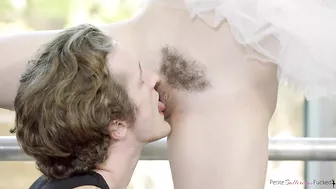 Description: American shortie Ember Stone wants to practice her dance moves and her sex moves. Her partner Brick Danger is happy to help her out. After letting her get down on her knees and blow his stiffie with a satisfying cock sucking Brick repays Ember s kindness with a landing strip pussy feast. He flips up her miniskirt and goes to town licking her greedy twat wetting her down for the main event. Turning around so that she can use the barre for balance Ember lifts one leg up to open the way for Brick to drive deep into her welcoming twat. His stiffie is just what this ballerina needs especially when she has the chance to straddle him and then give him a ride in her lusty snatch. When she falls to the side Brick is there to keep going pumping her to the climax she craves from behind. Now that she has had a chance to get off she wants to give Brick the same pleasure. Getting back on her knees Ember uses her soft mouth and sweet little hands to bring Brick to the edge of climax. When he finally cum it s all over Ember s face and mouth for a hot salty explosion.