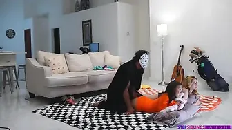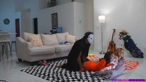 Description: Kimmy Kimm and Demi Hawks are having a sleepover. They get changed into their pajamas right into the living room while complimenting each other s bodies. Just as they re debating what to watch Demi s stepbrother Zane Walker offers them a movie he s got on his phone. While the girls are intent on the movie Zane puts on a mask and makes his move. Coming up behind Kimmy Zane begins feeling her ass up. She gives him the nod as he tugs her onesie aside to finger her twat. Pulling his hardon out Zane gives it to Kimmy as she lays there and tries to hold the moan. He keeps it up until he creampies Kimmy. Later Kimmy is asleep on the living room floor when Demi pulls Zane in and tells him the movie freaked her out. Now it s Demi s turn to try to hold the moan while Zane fingers and fucks her. Zane is buried balls deep between Demi s thighs when Kimmy wakes up and wants to join them. The girls share a kiss and then turn their attention to pleasure as Kimmy mounts Demi s tongue while Zane keeps her pussy party going. It s Kimmy s turn in the middle next and she goes ham eating Demi out while Zane bangs her. On her belly Demi takes it in doggy while lapping at Kmmy s clit. Eager to give Zane some bliss the girls get on their knees and take turns stroking him off until he wards them with a cum shot to share in a kiss.