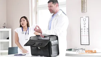Description: Naughty Asian nurse May Thai is at the clinic and gives her friend a call to tell her all about a hunky new doctor she has started working with. She gets so turned on that she starts rubbing her pussy through her panties and quickly hangs up the call to continue pleasuring herself. May uses her fingers to make her pussy soaking wet and after fingering her snatch this sex crazed slut fucks and sucks a glass dildo. She hears Dr Snakes calling from outside the room and quickly fixes herself together before his appointment starts. He finds her panties and questions her before they embark on a work fling! Dr Snakes takes out his huge cock and May sucks him off while he lays on the examination table. This petite Asian gets fingered and fucked in multiple positions before she not only offers up her ass but also takes a mouthful of cum to finish!