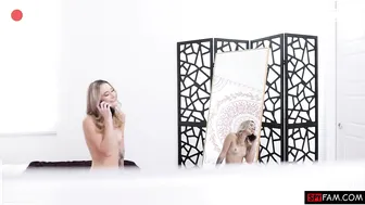 Description: Stepsister creeps on her stepbrother as he takes a shower and cant believe how big his cock is.