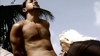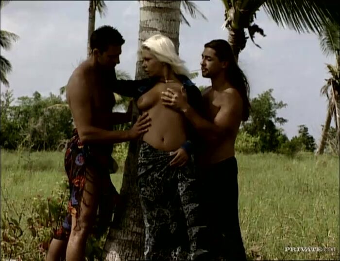 Description: Angelica Bright stands against a palm tree in this tropical setting. Two guys move to join her and each one starts sucking on one of her erect nipples. She squats down and gives them a double blowjob. They double penetrate her pussy and her ass before drenching her in sticky cum.