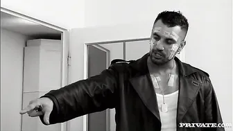 Description: Jessica Sanchez and Rachel Evans are lying down chatting with each other as this scene begins. A man sneaks into their place and they start sharing his cock while he stares at them. As the scene changes from color to black and white he changes from one girl to the next as he fucks them hard.