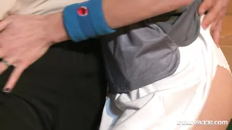 Description: Mademoisella Justine is always looking for a new way to stay in shape for her sugar daddy. When someone told her that racquetball was a great workout Mademoisella signed up for some private lessons. Little did Mademoisella know that he was going to be a hot stud and that she would get so turned on when he corrected her form. After tonights lesson Mademoisella had to know how big his cock was so she made the first move kissing him deep and stroking his dick. She loved feeling his cock swell to her touch and couldnt wait to taste it in her mouth. She let her instructor fuck her pussy and ass until he pops his huge load right into her mouth so as not to spill cum on the court.