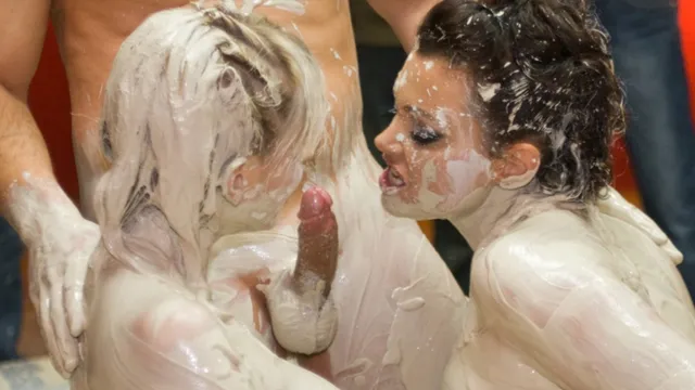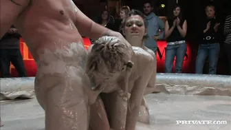 Description: Stella Delcroix and Terri Summers meet up with each other at this mud wrestling event. After they are fully covered in mud and naked a guy joins them and they give him a blowjob. They re all covered in the mud as he fucks them one after the other right there in the mud pool.