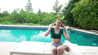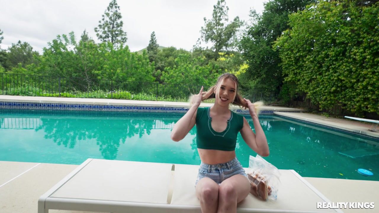 Description: Horny 21 year old Sophia Sterling shows up with some long thick wieners to the Cum Fiesta barbecue because she loves big dicks. The blonde shows her pert little tits and round booty to get past the door and chats about how she likes her pussy played with