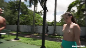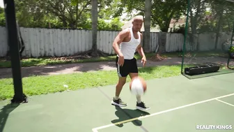 Description: Ricky Johnson and his buddy are shooting some hoops when they notice hottie Daisy Pheonix working out on the other side of the fence. Daisy s only too happy to join Ricky for a game and she suggests that they make it more interesting with a strip twist! Pretty soon the two are playing naked one on one and Ricky s impressed by her bubble booty while Daisy can t believe how big his dick is. He lifts her for an upside down BJ and fucks her doggystyle. Daisy gets all the dick she wants and a big facial.