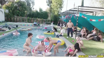 Description: What better way to celebrate your freedom on Independence Day than by getting fucked in the open air! Ember Jojo and Cali strut into the Fourth of July party looking to hang with their friends splash around in the pool and set off some sexual fireworks. Ember starts making out with Jake right away while Jojo and Cali play around a bit more starting a twerking competition in the shallow end and taking off their tops as they shake their asses with their friends before they zero in on all American hunk Van and his pocket rocket. After they suck on his cock in the water they get naked on dry land where both babes can ride Van s dick to their hearts content. Meanwhile Ember leads Jake by the boner to a chaise longue so he can eat her little pussy and then fuck her hard. You don t have to wait until after dark to see these fireworks!