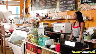 Description: Its Leisha Lushs first day working as a barista and she wants to do the best job she can especially when Jmac a regular customer comes in. When the luscious Leisha brings Jmac his coffee she notices his pants are unzipped and his cock is peeking out. However instead of telling him that his dick is hanging out she proceeds to tease this hung young man with her tasteful tits and amazing ass. Distracted by all the naughty thoughts running through her mind Ms. Lush splashes milk all over herself. She uses the happy incident as the perfect reason to strip down until she is only wearing her barista apron! All Leisha wants to do on her first day is make sure that she s pleasing her customers especially if it means getting on all fours and taking a big cock between her dripping wet pussy lips! So the next time you re in the mood to fuck a beautiful barista remember to give her a nice tip of your dick that is! Caution this ebony babe is here to please with some smoking hot content!