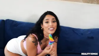 Description: Vanessa Sky can t get enough of Ricky Johnson s fat cock. He s been pounding her all day but she still wants more. She s doing everything she can to tease Ricky into giving her more wearing a tight pink slut collar and slurping on a rainbow cock shaped lollipop while she tells Ricky all about her nasty naughty past. The brunette babe pulls down Ricky s pants and fills her mouth with his dick loving every minute of it as she licks and teases it. Vanessa tells Ricky how much she loves being a good little slut and having her holes stretched out. Talk is cheap though and Vanessa knows she s got to show Ricky just how bad she needs some dick taking his fat hardon balls deep in her tight wet pussy. Ricky nails Vanessa from every angle making her shake and shiver with total submission to her inner nympho as she teases her pussy with her lollipop. Vanessa keeps on riding Ricky s cock until she gets what she really wants a nice thick load of cum dripping out of her pussy.