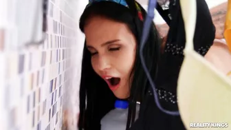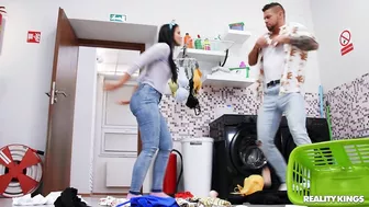 Description: Roommates Jennifer Mendez and Angelo Godshack have a long standing rivalry and things reach a boiling point when they both crash into each other while on the way to the laundry room. After spilling all their clothes Jennifer angrily starts to sort things Angelo though takes the opportunity to grab one of her bras and prance around with it to mock her. Jennifer returns the favor with a pair of Angelo s underwear but not before Angelo checks out her tits and ass. When Angelo blocks the machine after Jennifer loads her clothes they both reach for the detergent and play tug of war until Angelo lets go and the detergent spills all over Jennifer s tits soaking her shirt and revealing her hard nipples. Unfortunately for Angelo a bunch of detergent falls on the floor and he slips and falls backwards getting stuck in the machine. This gives Jennifer the chance to smother Angelo with her ass and get him to eat her pussy. From here Jennifer pulls Angelo out of the machine so that he can fill her pussy with every inch of his hard cock. Although Jennifer and Angelo wanted clean clothes it s clear that they both enjoy a wild and messy fuck.